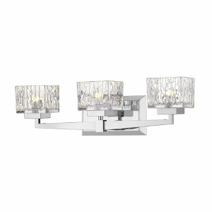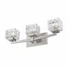 Modern design creates a silhouette worth showcasing in a contemporary bath space. This brushed nickel steel and crystal cut clear glass two-light vanity becomes a focal point in a remodeled or custom bathroom. Bathroom/Powder Room Shade Included: Yes Dimmable: Yes Material: Glass, Finish Color: Brushed Nickel, Width: 22", Height: 6.5", Length: 5.25", Depth: 5.25", Backplate Width: 4.75", Backplate Length: 8.75", Lamping Type: Halogen, Number Of Bulbs: 3, Wattage: 75 Watts, Dimmable: Yes, Moisture Rating: Damp Rated