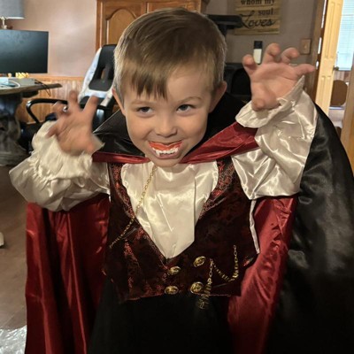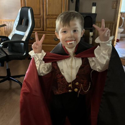 Your boy will be saying, I come to suck your blood when he wears this classic costume. The Boy's Transylvanian Vampire Costume is a totally traditional look. It features black pants, a white shirt with fancy red vest attached, a big red-lined cape with a tall collar, and a gold medallion on a red ribbon. Blood and wig not included.