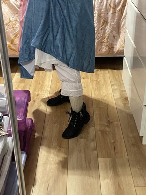 Since my sewing skills are limited, this costume works to achieve Kirsten's aesthetic. The size I chose was right, though the pantalettes a little snug and the dress loose. The bonnet is large. I have a petite frame so the sleeves are a bit long and the waistline a little low. Would have preferred a button or zipper closure instead of the velcro. The pocket and spoon bag are false and the handkerchief is sewn into the false pocket. All textures are screenprinted, so the spoon bag looks a little funny up close. Instead of being attached to clips, I would have preferred hair ribbons to tie.