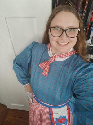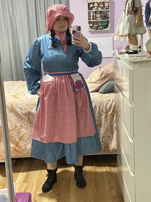 I ordered a Large, and it fits as expected for a size 12/14. The bloomers fit with some extra room, and the dress is loose enough in all areas. The colors of the dress, apron, and spoon bag are a shade or two more vibrant than on the doll's version of the outfit. The patterns are all the same, with some noticeable differences on the design of the spoon bag. I love the feel of the dress and the swishy skirt material underneath that makes it more full. Overall I feel extremely lucky to have this costume.