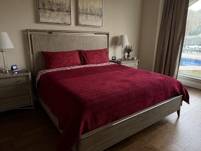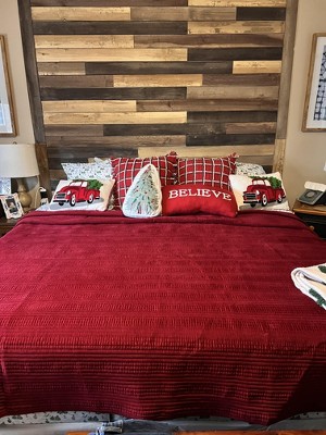 I bought this red quilt for the Christmas season, and it did not disappoint! The color is perfect—not too bright, not too dark—and it’s incredibly soft. It’s on the thinner side, but that’s fine since I’m using it with a duvet underneath. I washed it before putting it on my bed, so the photos show the quilt after washing and in natural light. I have a king-size bed—while it’s not very long on the sides, it still covers my mattress perfectly. I paired it with a Charter Club duvet set from Macy’s, and it looks fantastic together. I hope the shams come back soon!