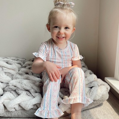 This is the cutest print! Love the petite bows and the ruffles along the sleeves and pant bottoms! We mix and match the top/pants with shorts/plain ts to make super cute daywear outfits too!