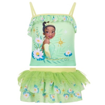 Blue Mermaid Princess Ruffle Tankini 2-Piece Swimsuit, with Signature Rear Ruffles. Dive into a magical underwater adventure with this enchanting blue mermaid princess tankini for girls, perfect for your little swimmer's summer escapades. This fully lined girls swimsuit offers not just comfort but also full seat coverage and delightful ruffle details that add a whimsical touch. Designed to resist snagging and pilling, the durable 4-way stretch fabric moves with your child, ensuring a great fit and long-lasting wear. Plus, with UPF 50+ sun protection, it keeps her safe from the sun's harmful rays while she plays. The vibrant blue color and mermaid theme make this princess theme swimsuit a charming choice for any poolside or beach activity. It pairs beautifully with accessories in white, gray, yellow, or brown, enhancing its versatility and style. The signature rear ruffles give an extra flair, making it a standout piece in any swim collection.