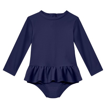 Have your little cutie ready for a day of fun in the sun with this RuffleButts Periwinkle Blue Seersucker Long Sleeve Rash Guard One Piece! Made with snaps at the bottom and functional back zipper for easy diaper changes and features signature rear ruffles for added flair. With this set, you will receive both the one piece swimsuit and a RuffleButts Bow Headband to match!