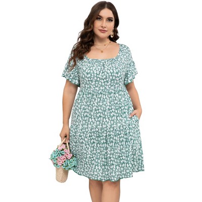 - Ruffled Short Sleeve Printed Maternity Babydoll Dress Dark green florals,2XL