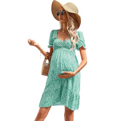 Ruffled Short Sleeve Printed Maternity Babydoll Dress Dark green florals,M