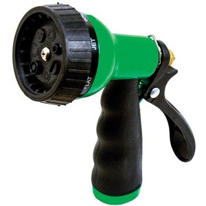 This 9 pattern hose nozzle is perfect for most household watering needs. Rear trigger design provides flow control for complete flexibility in watering. Featuring an impact-resistant plastic and durable metal nozzle design in a bright, fun color to ensure that it's easily visible on the lawn, plus a comfortable and ergonomic soft grip insulated cushion handle.