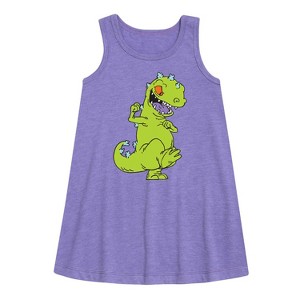 Rugrats - Reptar Dance - Toddler and Youth Girls A-line Dress - Embark on a nostalgic adventure with the Rugrats graphic apparel collection! Showcasing beloved characters like Tommy, Chuckie, Angelica, Phil, Lil, and more, each design captures the playful spirit and imagination of the iconic animated series. Perfect for fans of all ages, these pieces bring childhood memories to life with fun, colorful style.