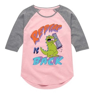 Rugrats - Reptar Is Back - Toddler And Youth Girls Raglan Graphic T-Shirt - Embark on a nostalgic adventure with the Rugrats graphic apparel collection! Showcasing beloved characters like Tommy, Chuckie, Angelica, Phil, Lil, and more, each design captures the playful spirit and imagination of the iconic animated series. Perfect for fans of all ages, these pieces bring childhood memories to life with fun, colorful style.