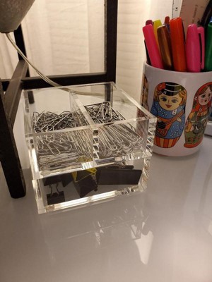 Perfect for organizing office supplies including paper clips and other small office essentials, can also be used to store your everyday beauty products in your bathroom. The size of our acrylic twin bloc also accommodates our quips and queries cards or use to display your personal business card. Use these trend forward acrylic pieces on their own, or stack them with other pieces in the russell+hazel bloc collection to create a custom system that adds life to your workspace.