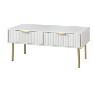 Elevate the aesthetic of your home with the Channel Front Living Room Rectangle Coffee Table by Lifestorey. Mid-century design inspired, this coffee table features gold-tone metal handles and legs that complement the white finish. Texture and dimension accentuate the distinctive grooved channel drawer front design. Constructed of durable MDF, this coffee table will add a taste of glam to any interior. Matching end table sold separately.