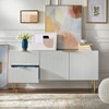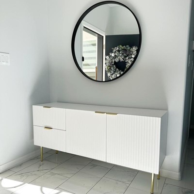 Elevate the aesthetic of your dining space with the Channel Front 60" Wide Sideboard Buffet by Lifestorey. Mid-century design inspired, this sideboard features gold metal handles and legs that complement the white finish. Texture and dimension accentuate the distinctive grooved channel door front design. Behind each cabinet door resides an adjustable shelf to store various sized serving pieces, decorative items, and dishware, while two spacious drawers are ideal for linens, flatware, and entertaining accessories. Perfect for your dining room or as a cabinet in your living room.