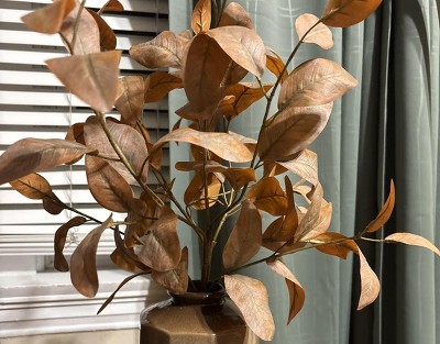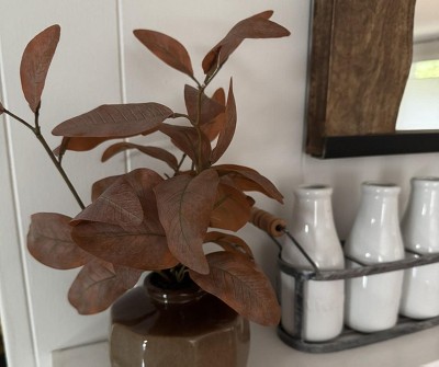 Add the spirit of autumn to your home decor with this Rusted Eucalyptus Artificial Fall Arrangement from Hearth & Hand™ with Magnolia. The artificial arrangement showcases eucalyptus branches arranged together and housed inside a textured ceramic pot that's filled with polyurethane foam and polyester faux floral material. The artificial construction requires no watering or pruning to maintain its appearance year-round, and you can place it on the entryway console alongside other potted plants for a welcoming appeal.