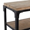 - •Industrial shelving unit highlights a natural wood brown finish and dark rusted metal frames