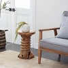 This Indonesia-made accent piece is an ideal side table to big sofa sets. It can also work as a footrest along narrow entryways and hallways. This item ships in 1 carton. The one-of-a-kind item you have purchased is made from the stumps and unused trunks of harvested teak trees. This teak comes from ecologically managed forests. Once the tree is harvested, the remaining stumps must be removed to make space to plant replacement trees. In the past, these pieces would be harvested and then burned to dispose of them, which created pollution. Today we use these tree stumps and trunks to create beautiful, handcrafted pieces for your home. Coloring, cracks, and shapes will vary between items. Each one is unique and the artisan works to bring out the inner beauty within the tree to become a cherished piece of art for your home. Suitable for indoor use only. Due to the live edges of the piece, each is unique, so no two products will have an identical pattern, shade, or cut. Maximum weight limit is 100 lbs. Made in Indonesia. This is a single accent table. Rustic style.