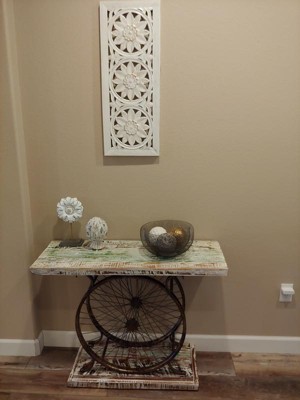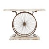 - •This nostalgic rustic console table showcases a rectangular wooden table top, a wheel-sculpted metal body, and rectangle lower base