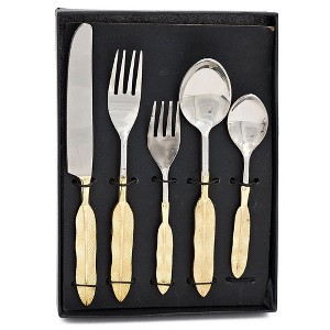An unforgettable table setting is all about the details. This cutlery set makes a dramatic impression with artful feather-shaped handles in a gleaming gold finish. Each set includes a teaspoon, a soup spoon, a salad fork, a dinner fork, and a knife ¨C all packaged in a handsome gift-ready box that doubles as a convenient storage solution between uses.