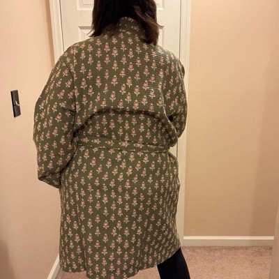I’m obsessed with this robe. It washes up so nicely and feels really high quality. The print is adorable and the fit good. This is the perfect light weight robe for Spring/Summer.