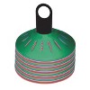 This ultimate set of 36 half cones will solve all your cone marker needs. It includes 6 cones each in 6 different colors and a plastic cone holder. These cones are made from super tough thermoplastic rubber that won't break or crack when stepped on, plus the material has more grip to keep it from sliding on smooth surfaces. Each cone measures 2”H x 8”D with a 2-1/4” hole at the top.