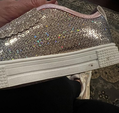 • Sequin embellished mesh upper with soft satin and glitter trim