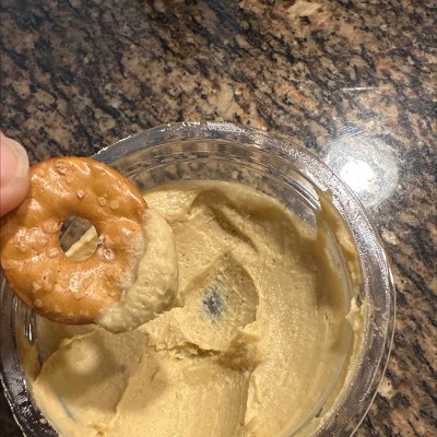 LOVE this flavor the garlic is a perfect amount of flavor. the texture is smooth and it is always resh. convenient packaging with the pretzels. so good for the price you pay