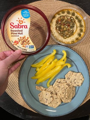 I love Sabra hummus-especially the roasted red pepper. I don’t think the pine nuts are the best additive to a delicious hummus. It’s a great dip for crackers, Naan, or veggies. It’s at an affordable price point as well.