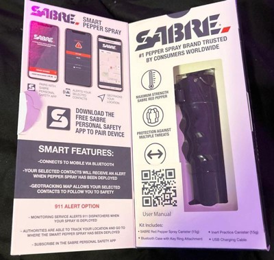 The SABRE SMART Pepper Spray uses Bluetooth® technology to connect to the free SABRE Personal Safety App on your iOS or Android smartphone. A free text message containing a link to a map with your location is sent to trusted contacts whenever the pepper spray is deployed. SABRE provides real-time GPS tracking, which continuously updates your location, keeping family and friends informed of your location until you’ve made it to safety. The SABRE app also includes a FREE in-app panic button. A SABRE exclusive optional monitoring service is also available in partnership with Noonlight, a 24/7 certified call center that contacts the police and provides real-time location data to help the authorities locate and assist you (paid subscription required). The SABRE SMART Pepper Spray is refillable and rechargeable for the best value of any smart pepper device available for ongoing use (refill cartridge 14-R-OC sold separately; charging cable included). It sprays 3X longer than the competition, defending against multiple attackers. Only the SABRE SMART Pepper Spray includes an inert practice spray with a Fast Flip Top safety, helping you build familiarity so you are confident and better prepared to use your pepper spray in an emergency. An ergonomic finger grip helps makes it faster and easier to hold for more accurate aim; the Fast Flip Top safety allows for fast deployment under stress and prevents accidental discharges. A key ring makes it easy to carry on the go. Safe, Smart, Connected, It’s SABRE. SABRE Pepper Spray is made in the USA. U.S. Patent: 11,402,172 B2.