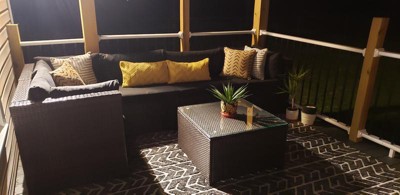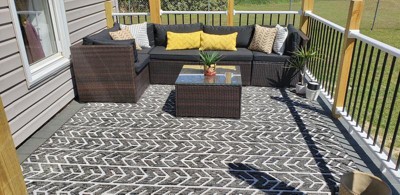 After time searching and researching for the perfect outdoor rug, I found it! Though it was more than I wanted to spend, I couldn't be more pleased with the look. This rug is not only stylish but easy on the feet (not hard or bristley feeling). It goes beautifully with my deck decor. Though it is still brand new, it has experienced some rainfall and has dried quickly. Worth the money in my eyes!