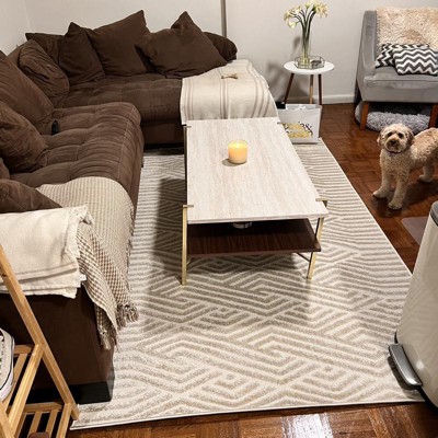 A: The rug features a soft, muted design with creative geometric patterns, enhancing any entertaining space.