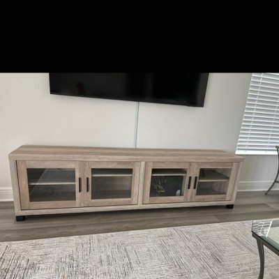 A: Thank you for your inquiry on our Sachin 4 Door TV Stand. This unit is offered in a Antique Pine and Dark Pine finishes. The glass panel is part of the door thus cannot be left out/removed. The unit requires full assembly so the door may be left off all together if desired allowing an open storage concept. We hope this helps with your purchasing decisions. Thank you.