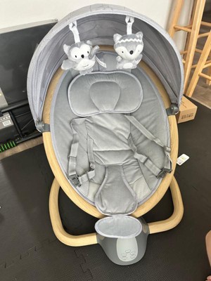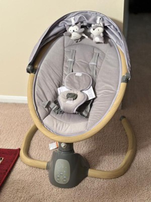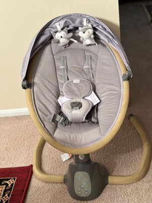 First off, I love the look of this baby swing. It's so cute and compact. It is much smaller than my other baby swing which I love. I love the gray and wooden accents. Very neutral and blends in well! Secondly, the features are great. Easy to use and very easy to put together! Took me like 3 minutes total. It comes with a REMOTE! That was an awesome surprise. The only con is that the swinging feature is not very "strong". My son is only 9 months and it barely swings on the highest mode. If he moves just a tiny bit, it will stop and it has to "catch up" to itself. So that being said- I think it's perfect for younger/lighter babies!