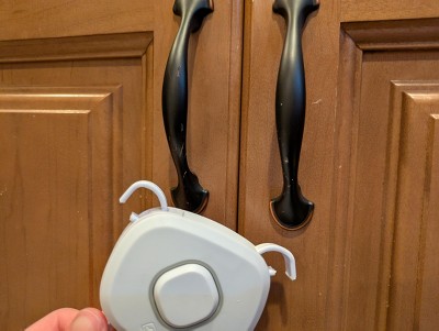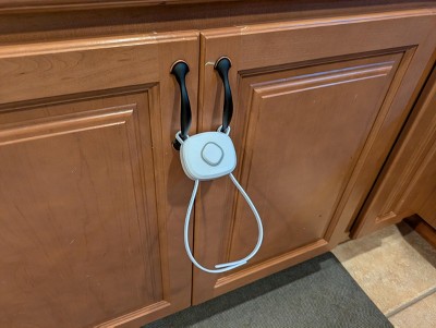 It installs easily with no drilling required. The adjustable straps let you get a customized fit for cabinets with hardware up to 8 inches apart and can be used on cabinets with either knobs or handle pulls. For periods of non-use, this cabinet lock hangs conveniently out of the way, but stays close for when it’s needed again.