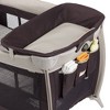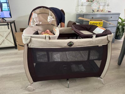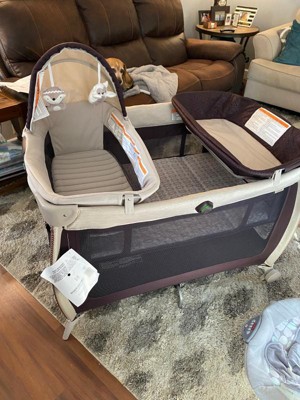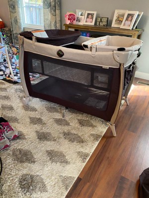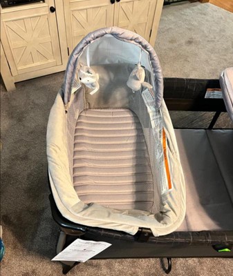 - Flip-away infant bassinet with airy mesh sides and true comfort memory foam