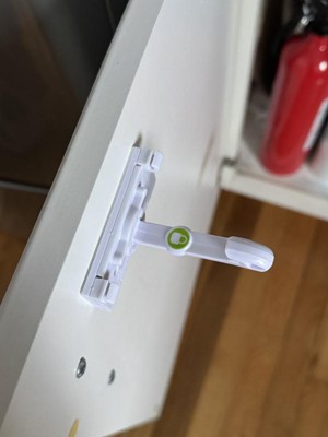 [This review was collected as part of a promotion.] The idea of adhesive locks to get little ones out of drawers and cabinets works great for people who are renting and do not want to perforate any surfaces. The instructions do say to leave it for 24 hours before using so that the adhesive qualities are at their best when one starts using them. They work for both framed and frameless cabinets. In our case, we had a frameless cabinet. The way the panel attaches to the vertical interior of the cabinet makes the second panel that is horizontal, jut out just a tad. So it wasn’t completely flush for us, making the cabinet door stick out ever so slightly. It is not noticeable at all but the adhesive area also sticks out and I have worried what it will look like after a few months with dust. I’ve attached a photo of the interior to show this and one of how much one door sticks out versus one that doesn’t (because the other door did not yet have the adhesive lock). To unlock, one has to slightly open the door, then press down on the bar for it to get clearance from the lock and voila. So far our little one has not been keen on opening cabinets or drawers but we’re hoping when he realizes he can’t open them anyway, that he’ll lose interest. So far, so good! I received this product as a part of the Stellar Product Testing Panel