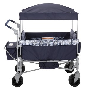 I received this wagon to try as part of a testing program and I am SO thankful I was able to try it! We were in need of a better wagon than the one we had prior. This wagon has some great features including a removable canopy all terrain tires and a push bar!! I loved having the push bar to use as opposed to just a pull handle due to it being more comfortable plus I got to have full view of what going on in the wagon at all times! The tires are great as well! They worked perfectly on grass dirt some sand and even mud after all of the rain TX has been getting. The canopy was nice to have I do wish there was a little cubby to tuck it specifically away when not in use. It also would be a great feature to add a little door so kids can get in and out safely and not be tripping or ruining the material. It is bulky and heavy so if it goes in the back of an suv it takes up most of the space. The brakes worked great for me and we loved all of the small pockets for water toys etc. overall we LOVE our wagon!