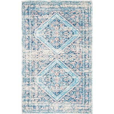Its traditional style effortlessly anchors your living space, while the intricate pattern displayed in the image speaks of a timeless aesthetic that pays homage to intricate florals and historical motifs. Each detail of the pattern, from the central medallion to the decorative border, is brought forth in shades of blue, accented with nuanced ivory and hints of earthier tones to create a sense of depth and dimension.
