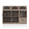Keep your kitchen and dining space arranged for easy organization at all times with this transitional wood buffet in chestnut brown. A pair of cabinet doors open to unveil plenty of space for storage items on the interior shelves while offering multiple pull-down cabinets for miscellaneous items. Unique chalkboard front panels on the pull-down cabinets offer a simple way to label what goes where for easy discovery. A suspended stemware rack and drawer in the lower corner complete the storage options of this piece, which is crafted of particle board, MDF, and metal.