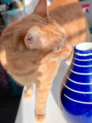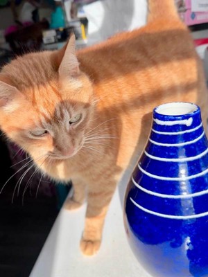 [This review was collected as part of a promotion.] This vase is so pretty. The I love the spiral design around the neck of the vase and the vibrancy of the blue color. Even my cat likes it! Their colors look so nice together!