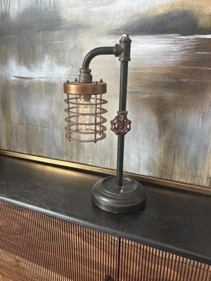 Add a touch of vintage charm to your space with this industrial-style table lamp. Designed with a striking blend of brown, gold, and metallic finishes, this lamp brings a bold, rustic aesthetic that complements any home or office decor. Its sturdy metal construction and detailed pipe-inspired design make it a standout piece that seamlessly enhances your desk, nightstand, or side table. Measuring 11 inches long, 6 inches wide, and 18 inches high, this lamp is compact yet impactful. Its caged light fixture diffuses a warm, inviting glow, creating a cozy ambiance perfect for your bedroom, living room, or workspace. Whether you need functional lighting for reading or a decorative accent for your industrial, farmhouse, or steampunk-themed decor, this lamp delivers both style and practicality. Built for durability, the lamp features a robust metal base that provides stability, ensuring it stays securely in place. The vintage-style valve detail adds an authentic industrial touch, while the weathered metallic finish enhances its antique appeal. The open cage design not only protects the bulb but also allows for maximum light dispersion, making it an excellent choice for task lighting or mood setting. Versatile and stylish, this industrial table lamp is perfect for adding character to your office desk, nightstand, or entryway table. Pair it with an Edison-style bulb for an even more authentic vintage look. Elevate your space with this unique lighting fixture and enjoy the perfect balance of functionality and decorative appeal. Order yours today and transform your space with industrial elegance.