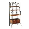 Elegant and beautiful, this unique black frame baker's rack is a blend of form and function. Combining the large countertop workspace and upper shelves in a warm mission oak finish with two spacious plastic rattan storage baskets, this kitchen organizer is sure to suit your needs. The decorative black with gold tipping frame and bottom shelf is crafted from iron tubing to ensure strength and durability.