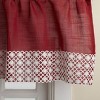 Bands of contemporary styled white daisy chain lace make a contrasting border on the solid color base cloth of this medium weight woven fabric design. Matching valance and swag complete this contemporary ensemble in dramatic color choices. Swags, Valance and Tiers are sold separately. Machine Washable.