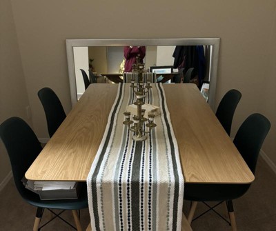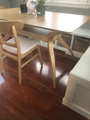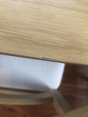 Had a hard time finding a larger table for my kitchen nook area with the right dimensions. Very happy with the table- relatively easy to assemble. It did come with a very little knick on the top, hope it doesn’t get larger! The top is not real wood like the legs, more of a laminate surface. At first only the legs came via fedex, then I had to wait two days for the table top to arrive!