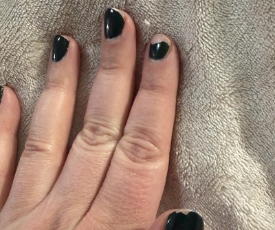 I used their clear for a base coat, did a layer of Chill Out and then again used their clear for a top coat. They did dry insanely quick and the Chill Out had nice coverage and a rich color but these pictures are less than 24 hrs later. 7/10 nails have chipped off. Unless you’re looking for a quick dry manicure that lasts no more than a couple hours, I wouldn’t recommend.