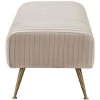 Introducing the Salome Upholstered Bench in almond with antique brass accents. This piece fuses style and functionality, making it a standout addition to any room. The almond fabric offers a soft and inviting touch, while the foam interior ensures a comfortable seating experience. Complemented by sleek metal and sturdy wood legs, it presents a harmonious blend of materials designed to elevate your living space. The antique brass details add a touch of elegance, making this bench an ideal choice for those seeking a sophisticated yet understated decor element. Transform your home with the Salome Upholstered Bench and enjoy a charming fusion of comfort and style.