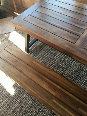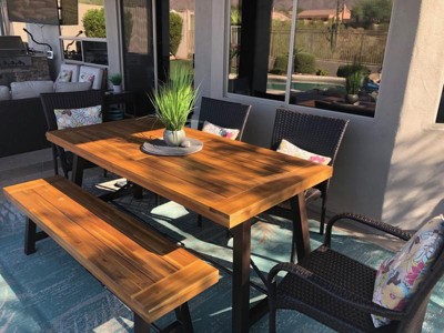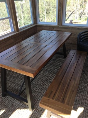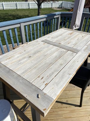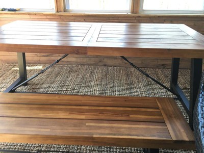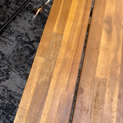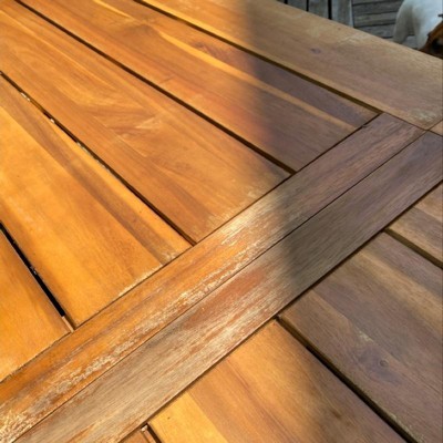I should have read the other reviews before purchasing this item. I was just so excited because it was exactly what I was looking for. 2 days after receiving the beautiful table, bench and chairs, the table FADED from being on my deck. TWO DAYS. The slates in the top of the table warped. I'm extremely shocked that Target still sells this item based off similar reviews.