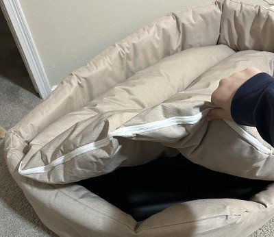 Beautiful dog but the fabric was not as expected. I would compare the fabric to a thick snow pant material. Makes loud crinkly noises when touched. Also, center bed is not attached so it can easily be moved by pets who dig to get comfortable. May return if my dog doesn’t warm up to it.