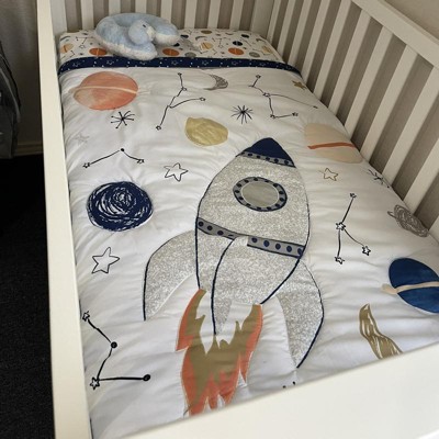 super cute space bedding! only thing I didn’t like was the bed skirt didn’t fit the crib good.