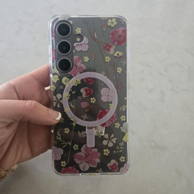 [This review was collected as part of a promotion.] This Samsung Galaxy s25+phone case is a pretty floral print perfect for spring time. It has the mag safe feature which is nice bonus. Overall it seems like a pretty standard case for the price. It is a hard plastic, so should protect the phone. My phone is black so the clear finish doesn't look great but, the clear finish would be nice for lighter colored (white, silver, pink) phones. I received an incentive to write this review.