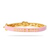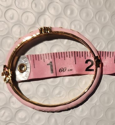 - Hinged bangle bracelet is crafted from yellow gold-plated brass. Pink enamel plating adorns the exterior