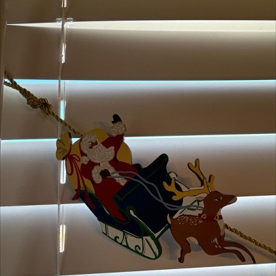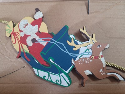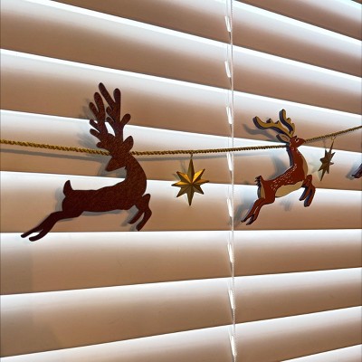 Bring the magic of the holidays to your home with this Santa's Sleigh and Reindeer Christmas Garland from Threshold™. This festive garland features a bright Santa in his sleigh carried by flying reindeer and accentuated by metallic stars for a festive charm. Featuring loops on both ends, you can hang this 72-inch garland on the mantel, your Christmas tree or along any wall.